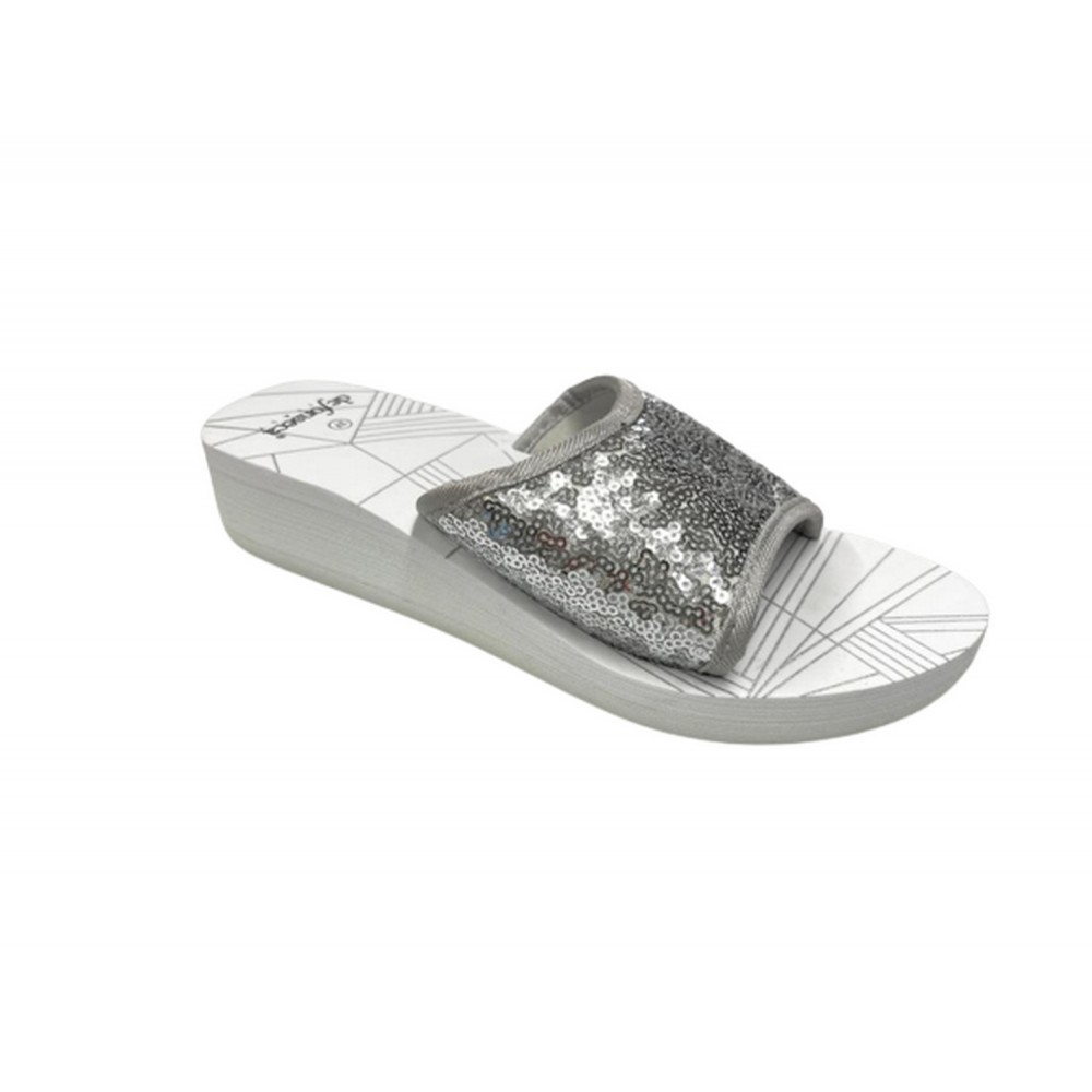 I nostri sandali in gomma EVA in stile slide sono ideali da indossare in spiaggia, in piscina e con i tuoi outfits relax delle vacanze. Sono impreziositi da paillettes sull' ampia fascia frontale e presentano una suola sagomata e antiscivolo.