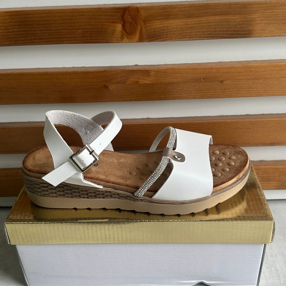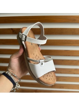 Un elemento distintivo è la decorazione sulla fascia anteriore, composta da strass o piccole pietre brillanti che aggiungono un tocco di eleganza e luminosità al sandalo.
