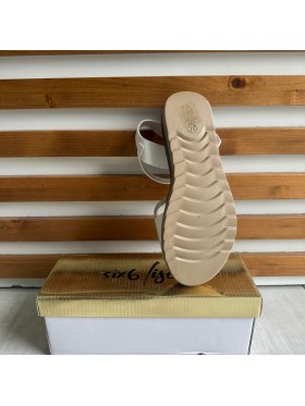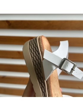 Il sandalo presenta una fascia larga sulla parte anteriore del piede e un cinturino regolabile alla caviglia con una fibbia metallica, garantendo una calzata sicura.