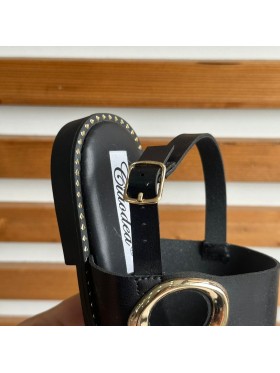 Elemento distintivo è la grande fibbia circolare dorata con un design a forma di anello che adorna la fascia superiore.