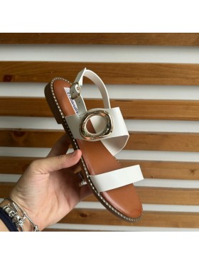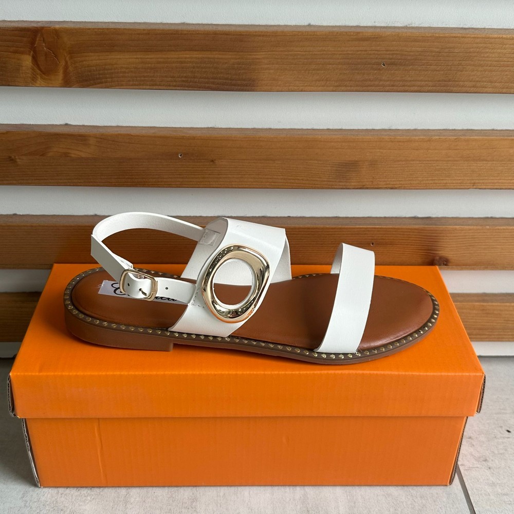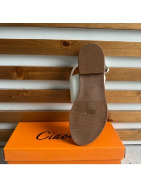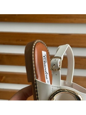 Il sandalo presenta una fascia larga sulla parte anteriore del piede e una cinghia più sottile che si avvolge intorno alla caviglia.