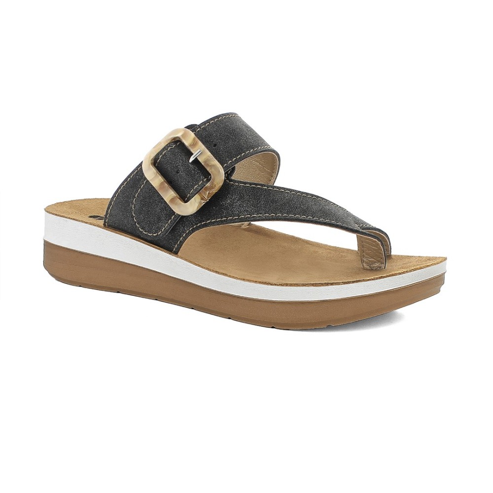 Queste nuove infradito presentano una tomaia con un'ampia fascia che attraversa il collo del piede, arricchita da una fibbia decorativa che aggiunge carattere e valorizza il design. Il plantare è realizzato in morbida pelle, mentre la suola bicolore include un rialzo di quattro centimetri.