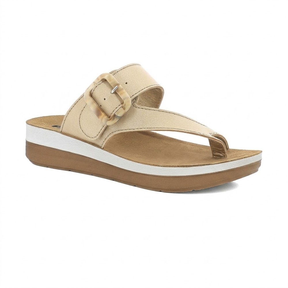 Queste nuove infradito presentano una tomaia con un'ampia fascia che attraversa il collo del piede, arricchita da una fibbia decorativa che aggiunge carattere e valorizza il design. Il plantare è realizzato in morbida pelle, mentre la suola bicolore include un rialzo di quattro centimetri.