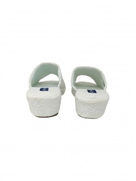 Le pantofole sono caratterizzate da un materiale esterno in tessuto, fodera interna in tessuto, suola antiscivolo in gomma, non è prevista chiusura ed ha una zeppa alta circa 4 cm.