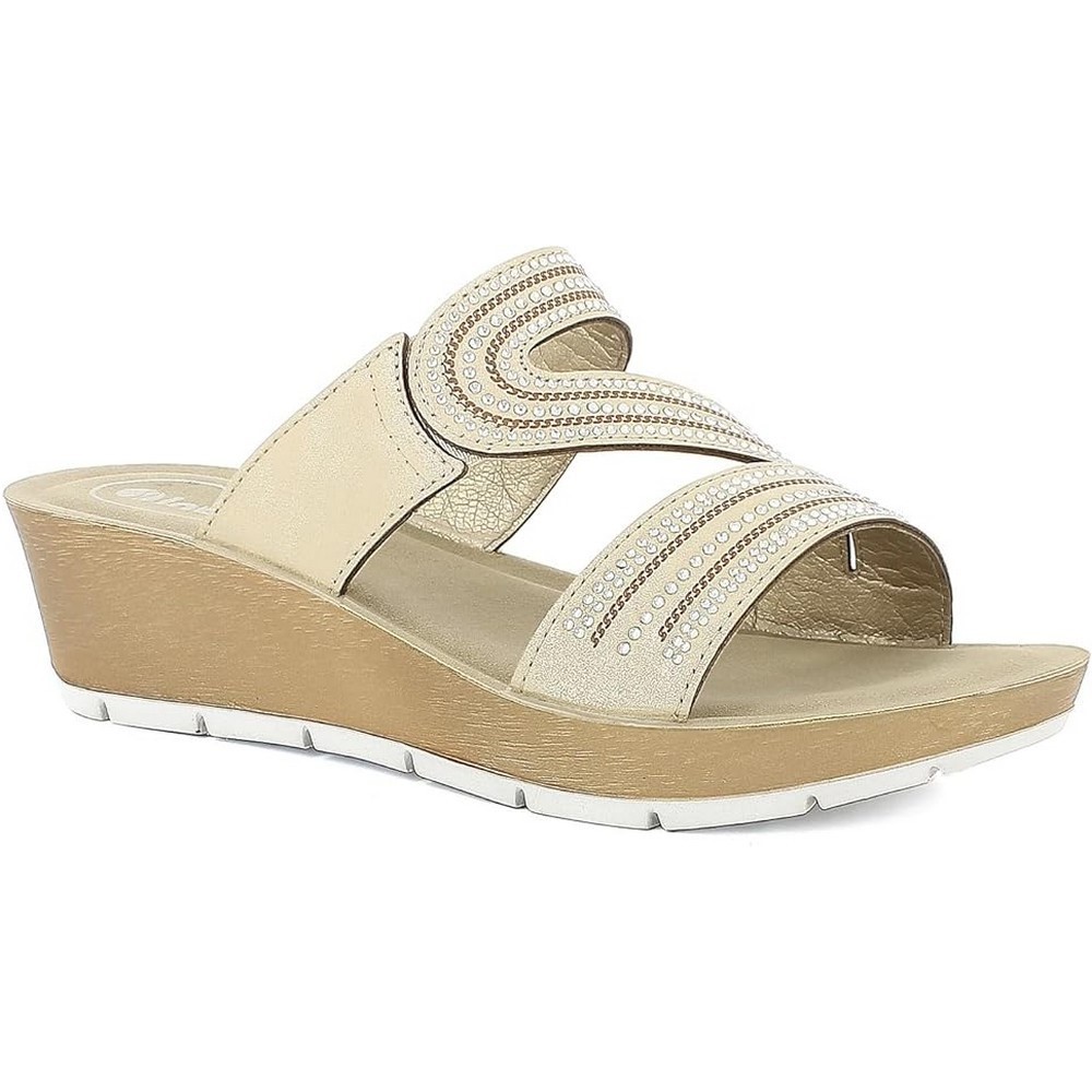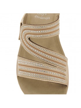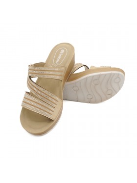 Ciabatte con tacco di cinque centimetri e tomaia a doppia fascia unita con particolare design a s ricoperto di strass. Un discreto inserto elastico fa sì che questa calzatura si adatti ad ogni collo del piede.La suola comoda e la luminosità di questa ciabatta ti conquisteranno!