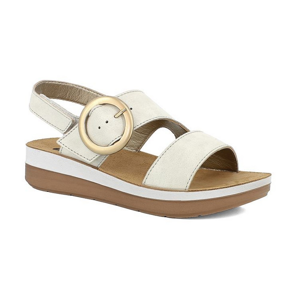 Comodi sandali con zeppa bicolore di quattro centimetri e plantare in vera pelle imbottito.Hanno una doppia possibilità di regolazione: a strappo e con fibbia tonda dorata.